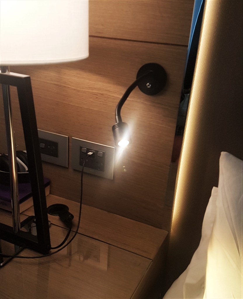 I’ve been in lots of hotels that either don’t have bedside reading lamps or have ones that are so dull they are useless or are only capable of lighting up the page of a book if you lie them on their side in order for the light to escape past the lightshade part which is too thick to actually let any light through it! Don’t get me started. But this little light (which is there in addition to a bedside lamp) is perfect.