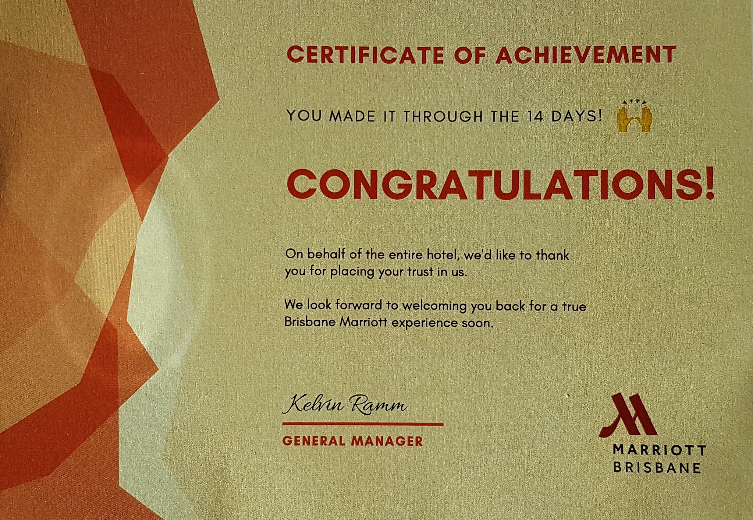 A big and heartfelt THANK YOU to the management and staff of the BRISBANE MARRIOTT along with the men and women of the Army and the Qld Police Force all of whom were friendly and helpful and took great care of us.